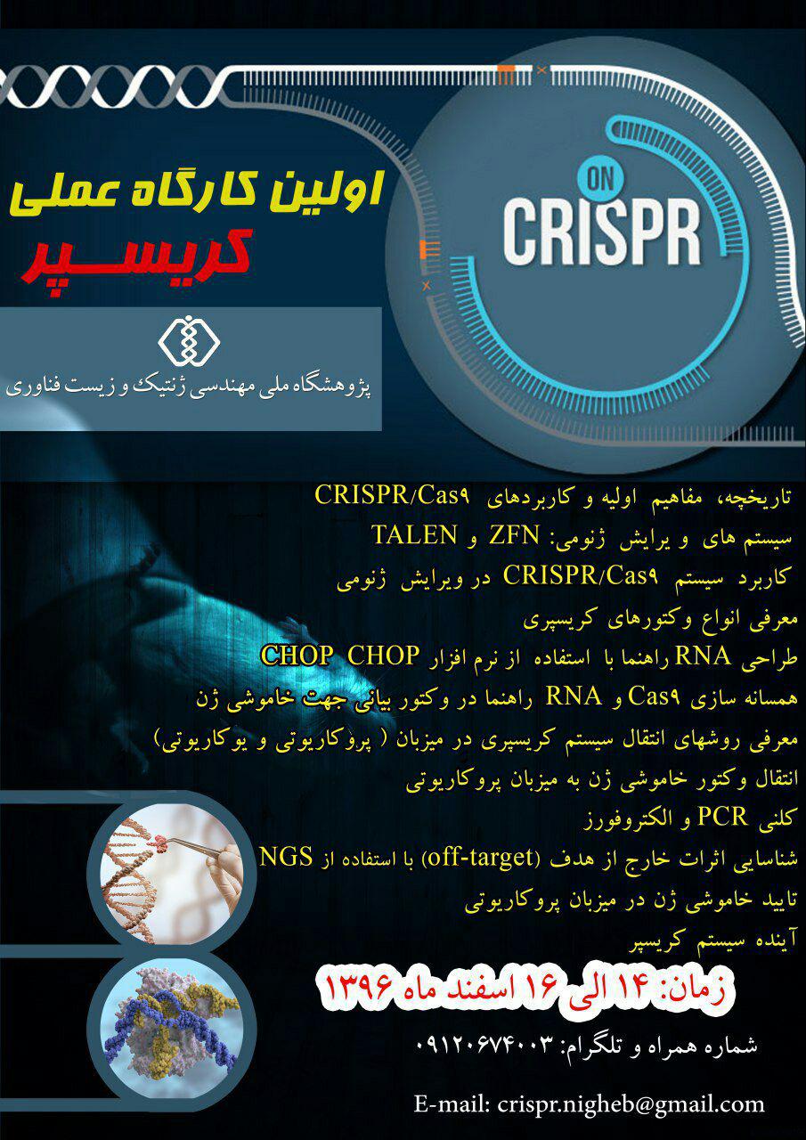 اولین دوره آموزش عملی تکنیک های ویرایش ژنومی با عنوان "کریسپر" 14 تا 16 اسفند 1396، در مرکز آموزش های تخصصی کوتاه مدت پژوهشگاه ملی مهندسی ژنتیک و زیست فناوری برگزار می شود.