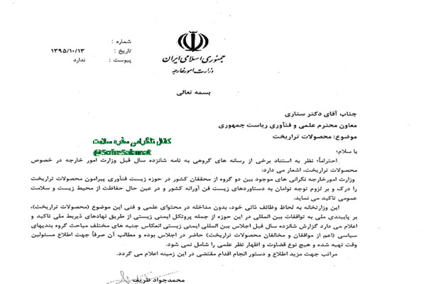 نامه دکتر ظریف به دکتر ستاری در مورد محصولات تراریخته