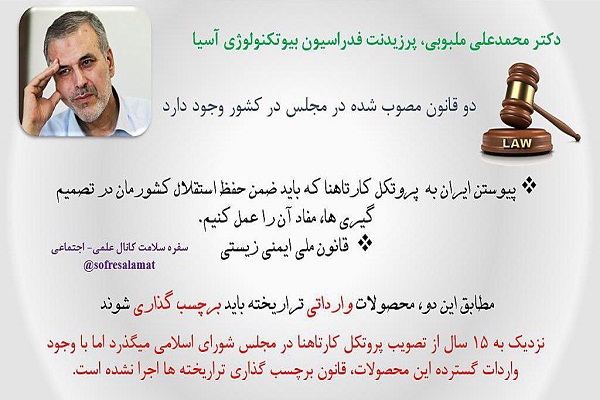 ملبوبی با بیان اینکه تصویب مجدد این قانون اشکال منطقی دارد. این قانون وجود داشته ولی متاسفانه که در کل اجرایی نمی شود، تاکید داشت: دبیرخانه شواری عالی ملی ایمنی زیستی این موضوع را رصد نمی کند و باید به اجرای این قانون تمرکز کنیم.